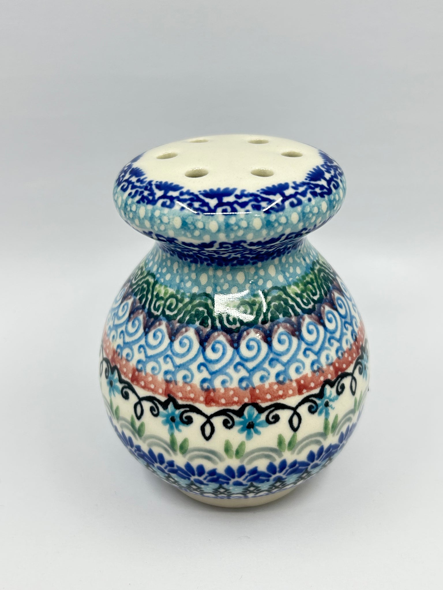 3.2" x 3.2".  Use with powdered sugar for your favorite kolacky cookie.  Wide holes also allows use for parmesian cheese. Oven, Dishwasher, Microwave and Freezer Safe. Made by Ceramika Artystyczna.